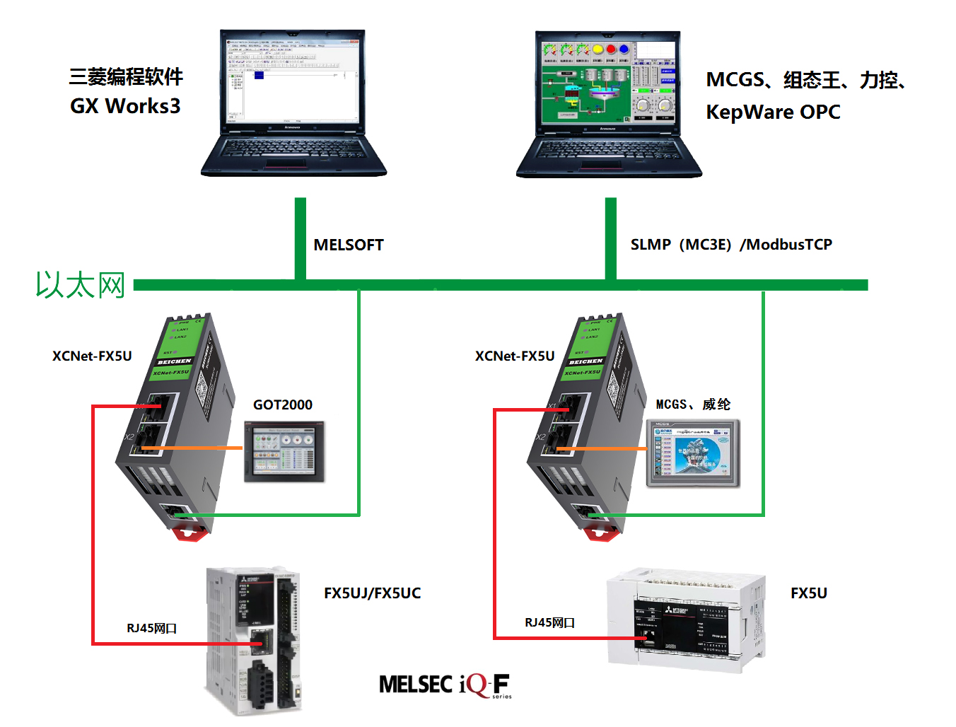 8、采用三菱SLMP(MC3E)協(xié)議或者ModbusTCP的方式,皆可實現(xiàn)高級語言(如VB、VC、C#等)編程,實現(xiàn)與PLC的數(shù)據(jù)通訊,方便開發(fā)生產(chǎn)管理系統(tǒng)。