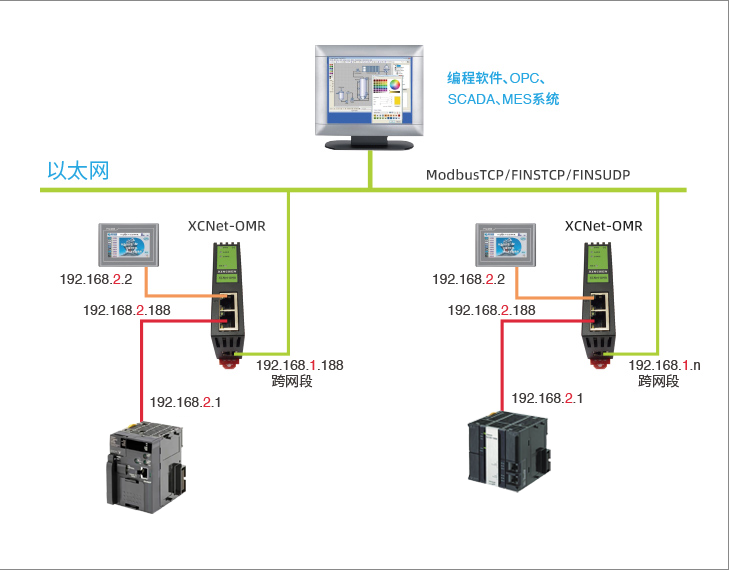 XCNet-OMR將歐姆龍PLC映射成LAN2口的ModbusTCP和FINS TCP服務(wù)器。